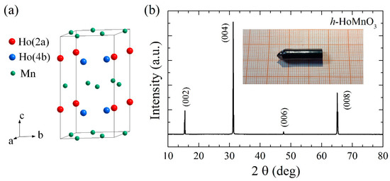 (a) Crystallographic geometry of the Mn3+ and Ho3+ ions in the h-HoMnO3. Two nonequivalent Ho3+ ions 2a and 4b are shown in different colors. (b) The orientation of the crystal surface using X-ray scattering analysis for the (002) plane. Inset of Figure 2 shows a picture of the as-grown h-HoMnO3 single crystal by the optical floating-zone furnace.