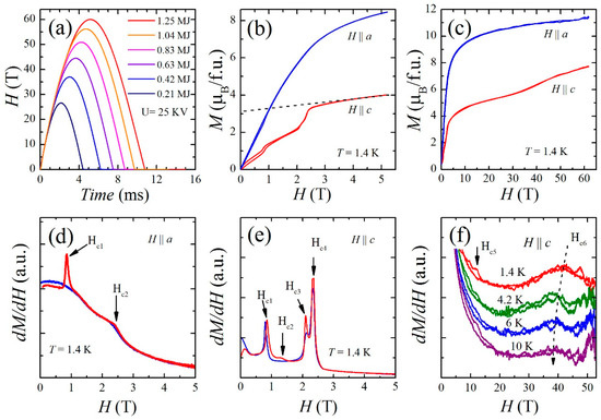 (a) Waveforms of pulsed fields driven by various capacitor banks. To generate an 11 ms/62 T pulsed field, a 1.25 MJ capacitor bank with a discharge voltage 25 kV is applied. While the 0.21 MJ capacitor bank is used to generate a ~4 ms short-pulsed field. (b) Magnetization data measured at 1.4 K for H//a and H//c, respectively. The data were measured using a ~4 ms short-pulsed field. The dashed line shows linearly extrapolating the magnetization data to zero fields. (c) A comparison between the a- and c-axis magnetizations in fields up to 62 T. (d,e) The derivative dM/dH of the data in (b). The red (blue) curve denotes the field-increasing (-decreasing) process. (f) The derivative dM/dH of the data in (c). The arrows in (d–f) indicate the field-induced magnetic phase transitions.