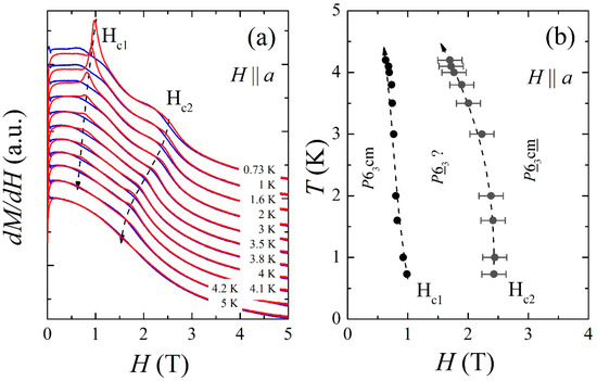 We first study the magnetic transitions for H//a. Figure 3a shows the dM/dH curves from 0.73 to 5 K. It is found that both Hc1 and Hc2 develop well with the temperature and almost disappear at 5 K. The corresponding phase boundaries are shown in the phase diagram of Figure 3b, which was not reported previously. When T is further increased, the two boundaries seem to end at the transition temperature of THo (5.4 K) at H = 0 T because the other two transitions (TSR and TN) appear at much higher temperatures of 32.8 and 76 K, respectively. It is known that the Mn3+ spins strictly orient in the ab plane, whereas the Ho3+ spins are mainly aligned along the c-axis due to a strong uniaxial anisotropy [2,13]. Therefore, we attribute the two transitions in Figure 3a to the magnetic reorientation of the Mn3+ spins in applied a-axis fields. As determined by the SHG experiment [13], magnetic symmetries of the two phases above and below THo are P63cm (Γ3) and P63cm (Γ1), respectively. Since no other transition is observed above THo by our magnetization data, the symmetry of the high-field phase should be the same as the high-temperature phase, i.e., P63cm. For the middle phase between Hc1 and Hc2, however, the magnetic symmetry is not clear at the moment. Interestingly, we find that the two transition fields are approximate to those of the magnetization jumps for H//c. Whether it is an intermediate phase (P63) or not as observed for H//c needs further investigation.