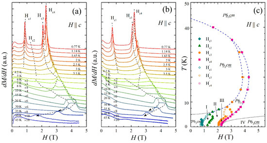 The most important feature of h-HoMnO3 is the successive magnetic transitions for H//c. We performed comprehensive magnetization measurements at temperatures from 45 down to 0.77 K. The derivative dM/dH data are shown in Figure 4a,b. There is a little difference in the low-temperature region between the data of H-increasing and -decreasing processes. It is ambiguous that the evolutions of Hc1 are opposite and Hc2 is almost invisible in the decreasing field. At temperatures above 6 K, the dM/dH curve shows a plateau, which moves firstly to the high field and then to the low field, as indicated by the dashed lines. From the dM/dH anomalies, we summarize the H-T phase diagram of H//c in Figure 4c. At a first glance, a dome-shaped phase (P63cm) below 43 K and an intermediate phase (P63) in a higher field are demonstrated, which are consistent with all early results [5,6,7,8,9,10,11,12]. Note that the phase boundary at 5 K and 0–1 T is not observed in this study. The reason is that this boundary is nearly temperature independent and thus insensitive to our measurement. Upon a close inspection on the low-T region, it looks different from those reported in Refs. [6,7,8,9], but similar to the result derived from the neutron scattering experiment [10,11]. Below 5 K, three phases labeled as I, II, and III appear between Hc1 and Hc4. The puzzling LT1 and LT2 phases determined by a dielectric constant are not observed in our data. Besides, the dielectric constant and susceptibility measurements revealed that Hc3 and Hc4 merged into one multicritical point at 1.4 K [2,7]. However, these two transitions, associated with a critical endpoint at 2.05 T and 2.2 K [18], can be distinguished in our data even down to 0.77 K. Another interesting finding in Figure 4c is the evolution of the Hc3 transition. From the neutron scattering data, Vajk et al. proposed a boundary extending Hc3 to a multicritical point at 7 K and 1.4 T [10,11]. However, this transition seems to end at 3.5 K and 2.5 T, where a first-order transition appears and separates phases II and III from the intermediate phase. It is noteworthy that similar hysteresis effect was observed in the same area by the dielectric constant measurement [6].