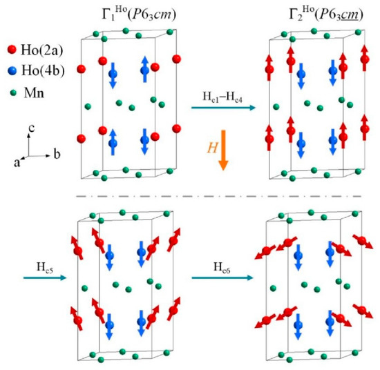 To understand the H//c phase diagram, the role of the Ho3+ spins and their interaction with the Mn3+ spins should be considered. In a zero field, the Ho3+ spins undergo a change of magnetic symmetry from P63cm to P63cm (Γ4→Γ3) at TSR and then another change from P63cm to P63cm (Γ3→Γ1) at THo [10,15]. While following neutron experiment did not find a transition at THo arising from the Ho3+ orderings [14]. For P63cm, all the Ho3+ spins are ordered along the c-axis. Due to a strong uniaxial anisotropy, it is hard to align the Ho3+ spins along the a-axis by magnetic fields. However, as shown in Figure 2c, the magnetic moment for H//a quickly reaches ~9 μB/f.u. at 5 T, much larger than the saturation moment (4.9 μB) of the Mn3+ spins. In the case of P63cm, the Ho3+ spins are disordered and may contribute to a rapid increase in the a-axis magnetization, in agreement with our magnetization data. In Figure 2c, the magnetic moment for H//c is smaller than that for H//a. This is because the Mn3+ spins lying in the ab plane do not contribute much to the c-axis magnetization. For H//c, the Hc3 and Hc4 transitions are accompanied by a large magnetization jump, see Figure 2b. By extrapolating the magnetization data above Hc4 to zero fields, the magnetic moment at 0 T is ~3.1 μB, which is nearly 1/3 of the effective moment of Ho3+ (10.4 μB). Given the four allowed symmetries (Γ1–Γ4) of Ho3+, only Γ2 (P63cm) can realize, such a ferrimagnetic phase. This scenario is similar to the 1/3-magnetization plateau phase in the analog h-RMnO3 (R = Er, Yb) [19]. Based on the above analysis, the variety of Ho3+ spin structures in applied fields is proposed in Figure 5. The Hc5 transition is characterized by other techniques, such as thermal conductivity [17]. A flip of the Ho3+ 2a spins at Hc6 coincides with a step-like transition at ~41 T. The reorientation of spins around Hc6 is not continuous, while it will be continuous above this transition in a higher field. The magnetic structures of phase I–III in Figure 4c remain unclear, which are likely a result of the rotation of the Mn3+ spins triggered by a mutual induction of the Ho3+ and Mn3+ moments [18].