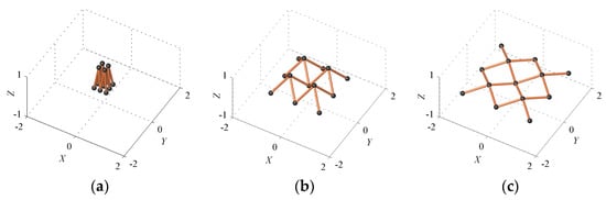 To verify the feasibility of the obtained solutions, four links connected by a common joint is taken as a basic unit, whereas n1 = n2 = 4. Then, according to the periodic symmetry, a simple deployable structure with 2 × 2 basic units can be assembled by repeating and combining two basic units along both directions of a 2D space. This structure holds four-fold symmetry. Mobility analysis shows that this structure is deployable with one degree of freedom (m = 1). Typical configurations during deployment of the structure are shown in Figure 3. It verifies that the structure keeps its original symmetry during transformations.