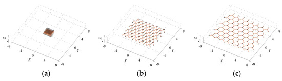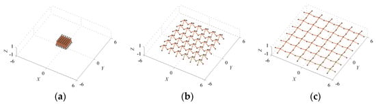For the fourth case with n1 = 3 and n2 = 6, the structural configuration is complex and composed of many more link members. The corresponding basic unit is formed by six links, which are intersected at the same joint, where the other end of each link is connected to two different links. For instance, Figure 6 shows typical configurations of a deployable structure with n1 = 3 and n2 = 6, which is also assembled by 8 × 8 basic units.