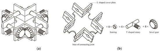 To avoid singularity of these deployable structures, a novel type of connecting joints with bevel gears is designed. Figure 7a illustrates an example of the joint with four pairs of bevel gears, which can ensure four connected links maintain synchronous motion. For clarity, Figure 6b describes the assembly of the joint.