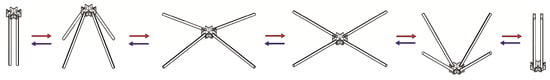 As expected, this structure exhibits three-fold symmetry and strong regularity. Notably, Figure 6 shows that this symmetric deployable structure can be smoothly transformed from the folded state to the fully deployed state, and the motion process is reversible. and can be smoothly deployed from a compacted state. During transformation, the joints attached on the two ends of a link member rotate on two different planes, where the rotation axes are parallel to each other. Moreover, because of the many more connected links, this type of structure shows much stronger stiffness than the structures presented above.
