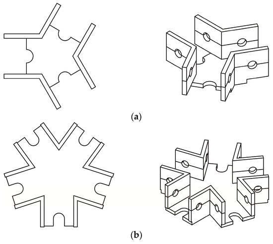 Inspired by crystals on 2D space [20], deployable structures should be neatly designed to exhibit regularity and periodic symmetry, which are beneficial to the involved fabrication, assembly, and cost. Here, inspired by different types of Bravais lattices in two-dimensional space [20,25], crystal-inspired deployable structures assembled by the link members with identical lengths and less than three types of connecting joints are concerned. Thereafter, a general link member of the structure is connected to two specific joints, which are respectively designed for connecting n1 links and n2 links. For example, Figure 1 shows two illustrative unit cells of deployable structures assembled by different types of joints.