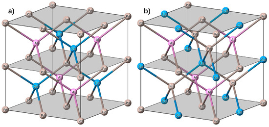 The Heusler alloys generally have two variants of stoichiometric compositions: the half-Heusler compound with generic formula of XYZ [52,53,54,55,56,57] and the full Heusler compound X2YZ [5,58,59], where X and Y are from transition metal elements and Z from main group elements. In both half and full Heusler alloys, they normally crystalize in a cubic structure yet with different configurations [60]: non-centrosymmetric cubic structure C1b for half-Heusler; two different types for full Heusler: the Cu2MnAl structure with space group , also known as L21-type, and the Hg2CuTi structure with space ground , also known as “inverse structure” or XA-type. For the currently studied full Heusler compound Pd2CoAl, the two structural types have been taken into consideration and they are shown in Figure 1. It can been seen that the full Heusler Pd2CoAl has the general FCC-like symmetry with four interpenetrating sublattices defined by Wyckoff coordinates: A(0,0,0), B(0.25,0.25,0.25), C(0.5,0.5,0.5), and D(0.75,0.75,0.75). In L21-type structure, the two Pd atoms occupy the A and C sites, which are symmetrically identical, and the Co and Al atoms enter into the B and D sites, respectively; see Figure 1a. In XA-type structure, the two Pd atoms occupy the A and B sites with different surrounding environments, and the Co and Al atoms enter into the C and D sites; see Figure 1b.