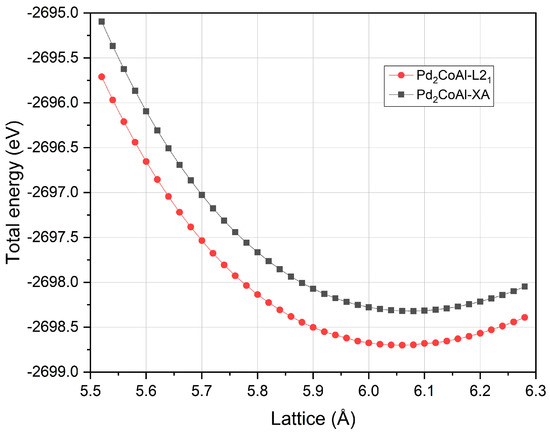 In order to determine the ground state structural configuration and also obtain the equilibrium lattice constant, we have calculated the total energy of Pd2CoAl with different structures under different lattice constants. It should be noted that only the magnetic state is considered, as in the literature [34], since there is Co atom present. The obtained result is reported in Figure 2. It is found that the calculated total energy of Pd2CoAl in L21-type structure is always smaller than in XA-type structure throughout the whole lattice variation range, which means the L21-type structure is more energetically preferable and should be the ground state. This observation is in a good agreement with the general site preference rule found in other palladium-based Heusler compounds [32,34], i.e., since the Pd atom has more valence electrons than the Co atom, it is more electronegative and prefers the A and C sties. Thus, the L21-type structure is formed for Pd2CoAl. After the crystal structural configuration of Pd2CoAl has been determined, we further calculated its equilibrium lattice by polynomial fitting and minimization searching of the total energy and the derived equilibrium lattice is 6.057 Å, see Table 1, which coincides very well with previous study [30,34].