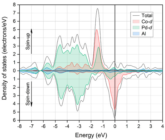 The calculated total and partial densities of states for the full Heusler compound Pd2CoAl in L21-type cubic structure at the equilibrium lattice constant.