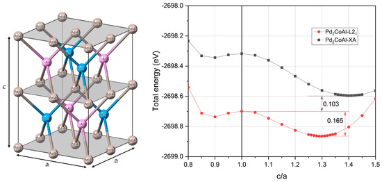 The tetragonal L21-type crystal structure for the full Heusler compound Pd2CoAl and the calculated total energies with two crystal structures under different tetragonal structures.