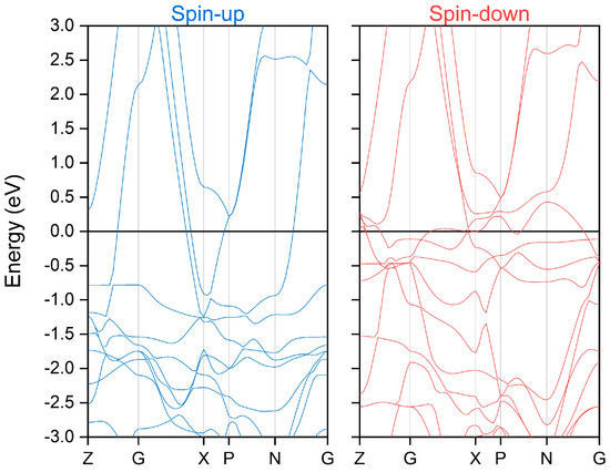 With the obtained equilibrium lattice constant, we can then investigate the corresponding electronic and magnetic properties of the full Heusler compound Pd2CoAl. Firstly, the spin-polarized electronic band structure has been calculated and it is shown in Figure 3. The Fermi energy is shifted to the zero energy level. It can be immediately observed that there are energy bands crossing the Fermi energy level in both spin directions, meaning that this Heusler compound behaves like metallic material at ground state.