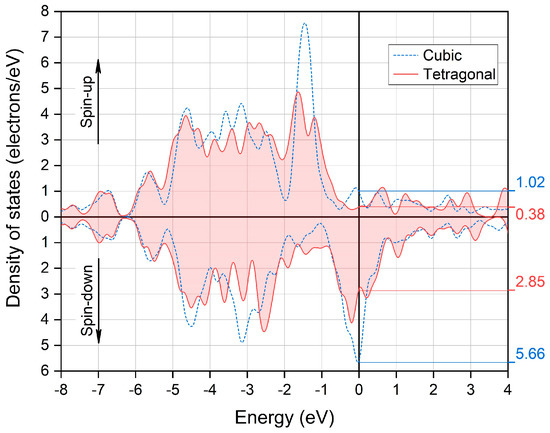 To understand the possible reasons for this tetragonal phase stability, we explore the total densities of states in both cubic austenitic phase and tetragonal martensitic phase; see Figure 8. We can see there is strong spin splitting of the states in the two spin directions, especially around the Fermi energy level, indicating the ferromagnetic behavior for both phases. However, the two strong spin split distribution areas in the austenitic phase have been compressed into much wider and shallower ones in the martensitic phase, which means the strong d-d hybridization and exchange splitting in the cubic phase have been weakened in the tetragonal phase. As suggested by previous study [30], the density of states at the Fermi energy plays an important role in regulating the phase stability. Thus, we further provide the values of states in the two spin directions for both phases at the Fermi level, as shown in the right vertical axis in Figure 8. It is found that the values in the spin-up and spin-down channels have been reduced from 1.02 states/eV and 5.66 states/eV in the austenitic phase to 0.38 states/eV and 2.85 states/eV in the martensitic phase. According to the Jahn–Teller effect, this decreasing behavior of the density of states proves that the martensitic phase is more stable than the austenitic phase.