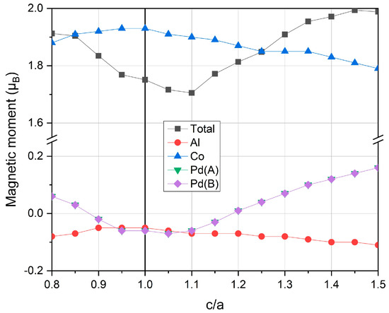 The calculated total and atom-resolved magnetic moments for the full Heusler compound Pd2CoAl in L21-type structure under different tetragonal strains. Note the different scale of the two parts in the vertical axis.