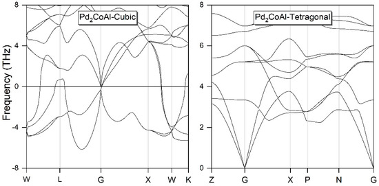 For the full Heusler compound, the possible martensitic phase transformation can be examined not only with energetic perspective but also by the dynamic and mechanical stability. The phonon dispersion spectra along the high symmetry points in the Brillouin zone for L21-type Pd2CoAl in both cubic austenitic and tetragonal martensitic phases have been calculated with the finite displacement method and the results are plotted in Figure 10. It is clearly seen that there is a strong softening behavior present in the cubic structure with a lot of imaginary frequencies, suggesting the structural instability of the austenitic phase. Whereas, the phonon spectrum in the tetragonal structure exhibit no imaginary frequencies and, thus, the system is dynamically stable. This structural instability in the austenitic phase could lead to the martensitic phase transformation.
