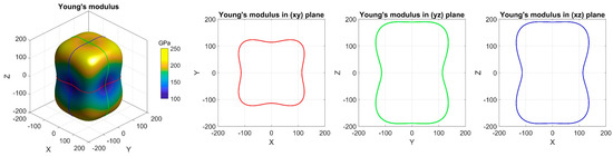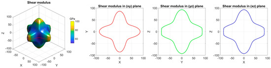 Moreover, with the obtained elastic constants we can further evaluate the elastic anisotropy in the tetragonal L21-type Pd2CoAl compound. The calculated 3D directional dependence of the Young’s modulus and shear modulus with ELATE program [65] are plotted in Figure 11 and Figure 12, respectively. Besides this, the corresponding 2D projections in different planes are also provided together. We can clearly see that the tetragonal Pd2CoAl compound has strong elastic anisotropy. The maximum of the Young’s modulus and shear modulus are found in the [111] and [001] directions, respectively.