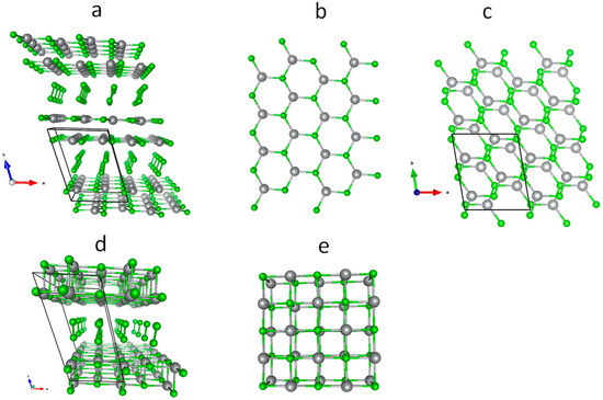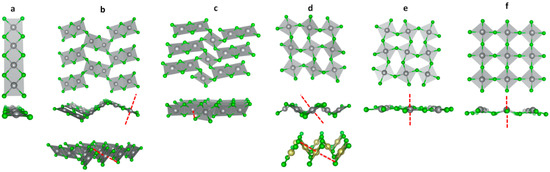 Three district structural patterns are observed among the layered polymorphs. In the first case, fragments of the ribbons may be distinguished that consist of two [AgCl4] units sharing one edge. These [Ag2Cl6] dimers then interconnect into layers by sharing corners (Figure 1b). Another structural pattern is formed by alternation of the same dimmers with single squares (Figure 1c). The third type of layers is formed by squares sharing only corners (Figure 1d–f). The layered polymorphs containing the dimeric units are unique among the halides. They are closely related to orthorhombic ramsdellite [36] and monoclinic γ-MnO2 polymorph form [37]. The ramsdellite structure consists of three-dimensional network of double chains of edge-sharing MnO6 octahedra while in the γ-MnO2 the double chains alternate with single chains of MnO6 octahedra (Figure 2a,b). In the predicted AgCl2 polymorphs with the dimeric [Ag2Cl6] units (Figure 1b), the three-dimensional network of the ramsdellite structure is reduced to two-dimensional one due to Jahn-Teller distortion of the octahedra that takes place in the direction parallel to the propagation of the chains. The same relation exists between the AgCl2 polymorph formed by alternation of the [Ag2Cl6] dimers with [AgCl4] squares (figure 1c) and the γ-MnO2 structure. Although no such halides exist, the ramsdellite-related AgCl2 structure has its zero-dimensional analogues in 4d and 5d transition metal pentachlorides such as MoCl5, Ta2Cl10, NbCl5, WCl5. They consist of dimeric M2Cl10 units of edge-sharing MCl6 octahedra aligned into infinite chains (Figure 2c). One can imagine obtaining the ramsdellite and the related layered AgCl2 structure by virtual polymerization of the M2Cl10 dimmers and subsequent Jahn-Teller distortion, respectively. While the layered structure containing the dimeric [M2Cl6] units are to best of our knowledge unknown, the layers with corner-sharing of square planar [MCl4] units are well documented for transition metal halides including CuF2, AgF2, or PdCl2; thus, it is quite natural to detect them for related AgCl2.