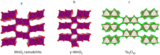 Crystal structure of (a) ramsdellite, (b) γ-MnO2 polymorph, and (c) that of molecular Ta2Cl10 crystal. In case of the MnO2 forms, the three-dimensional network of MnO6 octahedra is highlighted. In case of the molecular Ta2Cl10 crystal, selected van der Waals Cl…Cl contacts between the isolated edge-sharing MnO6 octahedra are shown to highlight its relation to the ramsdellite structure.