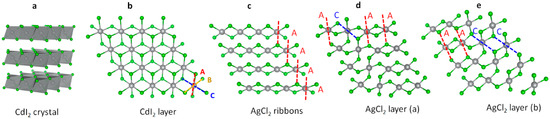 Three hypothetical AgCl2 ribbon-like polytypes (bottom) obtained with evolutionary algorithms and their relation to the CdI2 prototype (top left) and the known metal halides with ribbon structure (top and right). The differences of computed energy for (a–c) are minuscule.