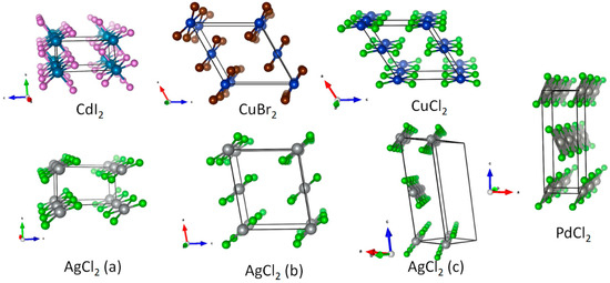 This study has begun in resemblance with our previous theoretical search for AgSO4, where we have employed the method of following imaginary phonon modes to reach dynamically stable structural models [16,17]. Using this method, we have optimized the hypothetical AgCl2 crystal in all known crystal structure polytypes taken by metal dihalides, MX2 (X = F, Cl, Br, I) (i.e., over 40 structure types) using the plane-wave code VASP (Vienna Ab-initio Simulation Package) [18,19,20,21,22], and subsequently calculated phonon dispersion curves for each model using the program PHONON [23]. In cases where at least one imaginary phonon was detected (signaling dynamic instability), we followed the normal coordinate of this mode to reach another, lower symmetry and lower energy structure [17,24], and we reexamined phonons after optimization. Due to complexity and CPU burden of the task this preliminary quest was conducted with LDA functional and lower plane-wave cut-off equal to 400 eV. In the second approach, the evolutionary algorithm approach was applied using XtalOpt [25,26,27,28] in combination with VASP and using GGA (general gradient approximation) with Perdew-Burke-Ernzerhof functional adapted for solids (PBEsol) and plane-wave cutoffs of 520 eV. Using the evolutionary algorithms, we have considered unit cells containing 2, 4, and 8 formula units and generated a pool of 2183 structures. The lowest energy structures originating from both methods were ultimately recalculated with spin-polarization, on-site Coulomb interactions and van der Waals corrections, as outlined below. Magnetic models were constructed for polymorphic forms containing genuine Ag(II) paramagnetic centers and the lowest energy spin arrangements were found using the rotationally invariant density functional theory DFT + U method introduced by Liechtenstein et al. where the values of both Hubbard U and the Hund J parameter are set explicitly [29]. The U and J parameters were set only for d orbitals of the Ag atoms and the values of 5 eV and 1 eV were used, respectively [30]. The van der Waals interactions were accounted for using the DFT-D3 correction method of Grimme et al. with Becke-Jonson damping [31]. Additionally, the hybrid DFT calculations with HSE06 functional were used to calculate the mixed-valence AgIAgIIICl2 solution that could not be properly stabilized at the DFT level.