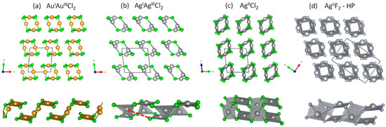 Crystal structure of Au(I)Au(III)Cl4 (a), AgCl2 optimized in the Au(I)Au(III)Cl4 structure (b), AgCl2 optimized in the Au(I)Au(III)Cl4 structure with the symmetry-enforced comproportionation AgIAgIII → AgIIAgII (c) and high-pressure polymorph of AgF2 (d). Top view: stacking of the chains, bottom view: connectivity within single chain.