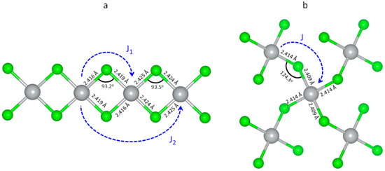 Fragment of the AgCl2 ribbon with two relevant intra-chain superexchange constants considered in this study (a). Fragment of the corrugated AgCl2 sheet with one relevant intra-sheet superexchange constant considered here (b).