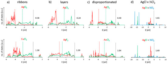 Comparison of the electronic density of states (DOS) graphs of four studied structures of AgCl2 and their counterparts: (a) ribbon structure and CuCl2, (b) layered structure and AgF2, (c) disproportionated structure and AuCl2, (d) Ag(I)[Cl(Cl2)½] form with hexagonal AgCl layers and the sum of eDOS of rocksalt AgCl and solid Cl2. Red and green dashed lines indicate the DOS-weighted average position of Cu/Ag/Au d and Cl/F p bands, respectively. The number above Fermi level in each graph indicates the fundamental band gap.