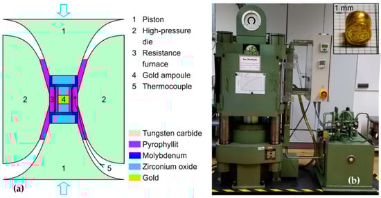Schematic cross-section (a) of the high-pressure die and the pressure cell of the belt press at the Max-Planck-Institute for Solid State Research (Stuttgart, Germany), and the gold ampoule after treatment ((b), top).