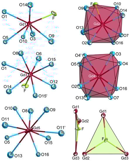 The crystal structure of Gd5FW3O16 comprises five crystallographically distinguishable Gd3+ cations (Table 2 and Table 3) with coordination numbers of seven (Gd1), eight (Gd2–Gd4), and nine (Gd5) set up by both oxide and fluoride anions (Gd1–Gd3) and only by oxide anions (Gd4, Gd5), respectively. While the coordination polyhedra of the cations (Gd1)3+, (Gd3)3+, and (Gd5)3+ are irregularly shaped, the ones for (Gd2)3+ and (Gd4)3+ can be described as distorted square antiprisms (Figure 3). Both the Gd3+–O2− distances of 219–295 pm and the Gd3+–F− distances of 230–236 pm (Table 3) are in good accordance to correspondent values found in literature (e.g., in Gd4O3F6 (C.N. (Gd3+) = 9 + 4): d(Gd3+–O2−) = 215–296 pm, d(Gd3+–F−) = 215–278 pm []). The fluoride anions are surrounded by three Gd3+ cations (Gd1–Gd3) with a deviation of about 14 pm out of the plane built up by the F− anions (Figure 3, bottom right) and Gd–F–Gd bond angles of 111–130° (Table 4). A very similar environment of the fluoride anions is found in the crystal structure of the lanthanum(III) fluoride oxidomolybdate(VI) of the composition La3FMo4O16 [], in which the La–F–La bond angles range between 108 and 137° and the deviation of the fluoride atoms out of the plane built up by La3+ cations is about 24 pm. For (Gd5)3+, a rather high and very prolate displacement ellipsoid is noticeable (see Figure 3 bottom left), which can be explained by an anisotropic distribution of the distances between these cations and their surrounding oxide ligands. Although being the gadolinium cation with the highest coordination number, only four O2− anions (O5, O8, O10, O16) are found with distances shorter than 236 pm. These form a belt (or very flat tetrahedron) around (Gd5)3+, roughly situated in the crystallographic (241) layer. Hence, these cations “escape” the stress of a tight, almost two-dimensional surrounding by extending their displacement anisotropically perpendicular to the aforementioned layer. Of the five oxygen atoms with distances longer than 250 pm, the shortest one (O15) also resides within the aforementioned belt, while the four longest ones (O9, O11, O11’, O13) are situated in the direction of the longest principal axis of the displacement ellipsoid of (Gd5)3+.
