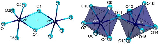 Distorted [WO6]6− octahedra in the crystal structure of Gd5FW3O16 (ellipsoid representation at 95% probability), which are connected via common edges to discrete [(W1)2O10]8− units comprising an inversion center ○ (left) and by sharing vertices to also discrete [(W2)(W3)O11]10− entities (right).