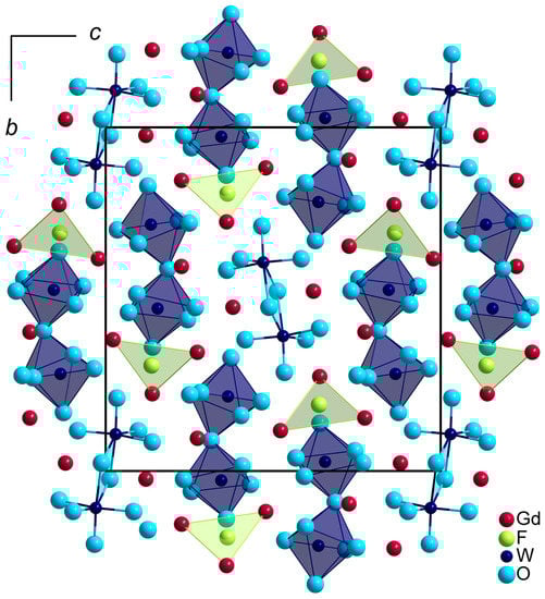 View at the expanded unit cell of Gd5FW3O16 along [100] emphasizing [(O4)2(W1)2]8+ rhombuses of the [(W1)2O10]8− entities (light blue), [(W2)(W3)O11]10− units (dark blue), and the trigonal non-planar coordination environments of the F− anions (green).