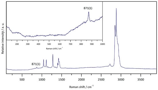 Single-crystal Raman spectrum of Gd5FW3O16 (only visible band at 871 cm−1) embedded in desiccator grease (bands between 1000 and 3100 cm−1) under excitation with a green LASER (λ = 532 nm).