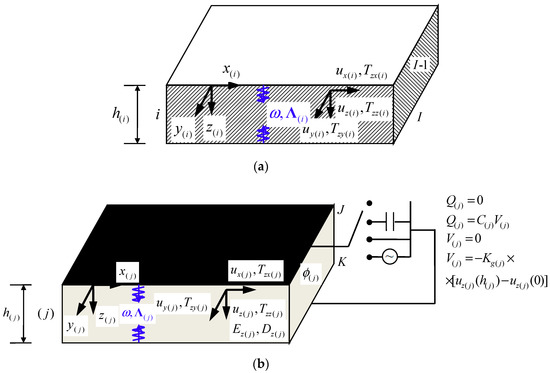 According to the 3D piezoelectricity, the fundamental elastodynamic equations of a typical arbitrarily anisotropic piezoelectric layer , as seen in Figure 2b, can be given. From both mechanical and electrical considerations [80,81,82,83], all the equations are identical to those of elastic layer except that the constitutive equation currently should be written in fully matrix notation as