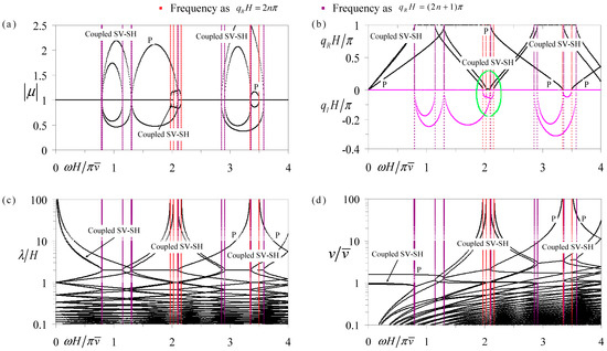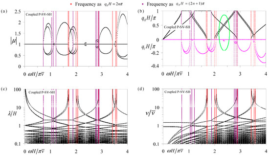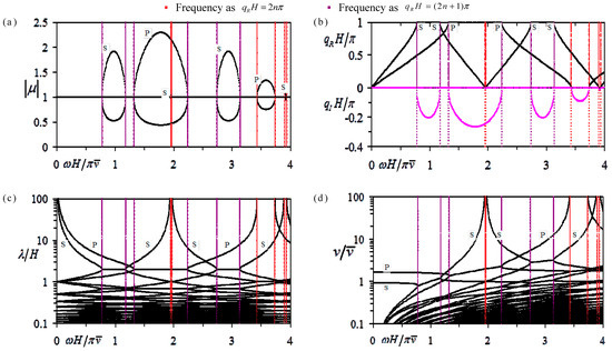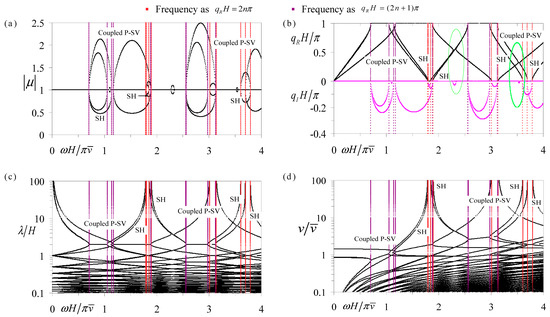 The comprehensive frequency-related dispersion curves of the coupled P-SV and pure SH waves in periodic Glass-Brass-LiNbO3B-Brass multilayers with electric-short boundary: (a) eigenvalue amplitude spectra; (b) wavenumber spectra; (c) wavelength spectra; (d) phase velocity spectra.