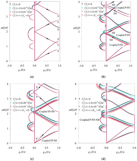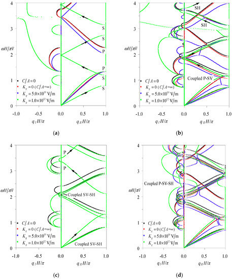 In this section, the frequency–wavenumber spectra (band structures) of elastic waves along thickness in laminated piezoelectric phononic crystals with the unit cell consisting of Glass-LiNbO3A layers and the piezoelectric layer being in a state of electric open are analyzed by the formulation described above, so that the proposed method and the corresponding computer program can be validated in this degeneration situation. The elastic waves in this case are decoupled into pure SH, SV and P waves, so the computed results can be compared with their counterparts obtained by the explicit formula in Galich et al. [86] or identically in Shen & Cao [87], as provided in Figure A1. It is worth noting that the equivalent elastic constant is used for the LiNbO3A layer in the explicit formula so as to take its piezoelectric effect into account. From Figure A1, it is seen that the band structures gained by the two methods are exactly coincident, which proves our proposed method in this paper. Besides, note that the wavenumber spectra of the SH wave are superposed exactly on those of the SV wave due to the same wave speed.