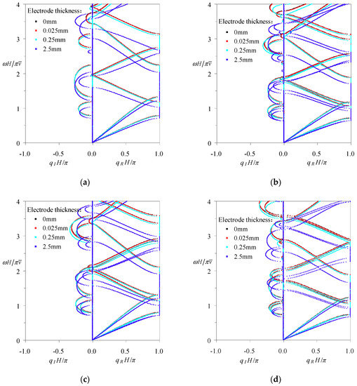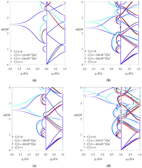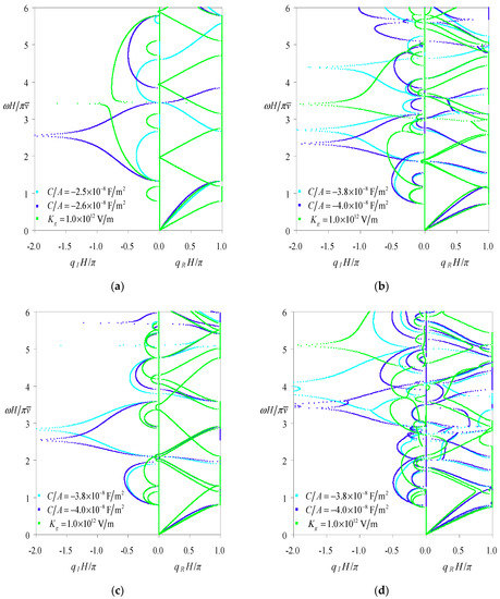 To search the general features of the comprehensive frequency-related dispersion curves, the electric-short boundary is adopted in the calculation, because the spectra associated with this electrical boundary serve as the limiting curves for both the applied capacitance and the applied feedback control boundaries as will be shown in Section 5.2. Figure 3, Figure 4, Figure 5 and Figure 6 give the results of these comprehensive frequency-related dispersion curves for the periodic structures consisting of Glass-Brass-LiNbO3A-Brass, Glass-Brass-LiNbO3B-Brass, Glass-Brass-LiNbO3C-Brass, and Glass-Brass-LiNbO3B-Brass-LiNbO3C-Brass configurations, respectively; subfigures (a–d) in these figures represent the relations between the frequency and the eigenvalue amplitude (), the wavenumber (), the wavelength (), and the phase velocity (), respectively. The corresponding wave modes of all the spectra in these figures are marked out.