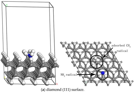 When the effects of doped radicals on the adsorption energy of CH3 are studied, the calculation mode is built, as shown in Figure 2. The CH3 radical is adsorbed on the active carbon site at the center of the model, the NH2, BH2 or SiH3 doped radicals are adsorbed at the C atom adjacent to the active carbon site according to the doping conditions. Due to the high symmetry of the diamond (111) surface, the carbon site adjacent the center carbon site is all equivalent. However, there are three different adsorption sites for the doped radicals on the diamond (100) − 2 × 1 reconstructed surface as shown in Figure 2b.