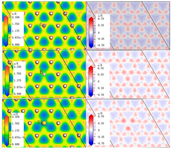 Due to the adsorption energy of CH3 on different doped diamond (100) and (111) surface sharing a same variation tendency, the cases of CH3 adsorbed on diamond (111) surface is used for further analysis. Since the atoms in the surface region can move freely in the calculation, the change of the model geometry and the electronic structure before and after adsorption will have a significant impact on the final adsorption energy. Firstly, the charge distribution of diamond surface before CH3 adsorption as shown in Figure 3 is analyzed. The total charge density distribution range in 0~2.35. It can be seen that the total electron density of boron doped, silicon doped and nitrogen doped diamond is similar with that of undoped one. The results indicated that the bonding structure between doped atoms and carbon atoms is similar, and there is no chemical bond breaking. It is well known that there are five valence electrons in the outer layer of N atom; pair electrons will form when the N atom interacts with three carbon atoms in the secondary layer of the diamond slab. The forming of pair electrons will enable a stable electronic structure of the diamond surface. Therefore, it can be seen from the total electron density of the diamond surface that the surrounding region of N atom is a charge enrichment region. Moreover, the charge density difference is also analyzed, and the charge density range is −0.7~0.7. The region where the electronic decreased is shown in blue, electronic enrichment is shown in red, and white indicates that electron density is almost not changed in one region. As indicated in Figure 3b, the boron atom center is blue while the nitrogen atom center is red. The results reveal that boron atom loses electrons while the nitrogen atom gets electrons. The results of Mulliken population analysis show that C has no electron gain or loss, Si lost 1.27 electrons, B loses 0.62 electrons, and N gets 0.39 electrons.