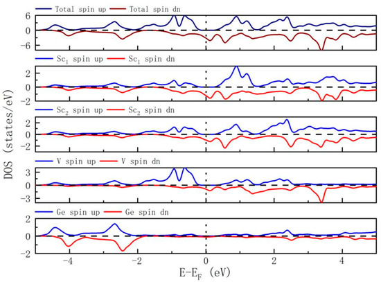 To analyze the contribution of each atom to the energy bands, we calculated the total density of states (TDOS) and the partial density of states (PDOS) for each atom. It can be seen from Figure 4 that the low range of energy states (lower than −2 eV) of TDOS are mainly due to the contribution of the atoms of the main group element Ge, such as the peak in the energies between −4 eV and −5 eV and peak in the energies between −3 eV and −2 eV. There are two obvious peaks in spin-up channels near the Fermi level that range from −1 eV to 0 eV, and the main TDOS in this range comes from the contributions of V atom. Further, Sc1 and Sc2 atoms also contribute a small part to the energy states from −1 eV to 0 eV. Near the Fermi level, the TDOS of the spin-up channel is zero and has a large energy gap, whereas the spin-down channel is not zero, which mainly results from the hybridization among Sc1, Sc2, and V atoms. From the DOS, similar to the calculated band structures, one can see that half-metallic property with full spin polarization is found in XA-type Sc2VGe. Moreover, from the TDOS, we can see that the energy gap in the spin-up direction is generated by four peaks, two peaks below, and two peaks above the Fermi level. As discussed previously, the two peaks below the Fermi level are mainly derived from the d orbital of V atoms. The two peaks above the Fermi level, as can be clearly seen, are mainly derived from the d orbital of Sc atoms. Moreover, the hybridization of d-d orbitals between V and Sc atoms plays an important role, which cannot be ignored, in the formation of energy gap in the spin-up channel.