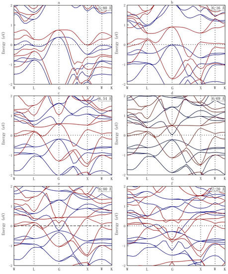 Uniform strain is an important way to regulate the band structures, i.e., the physics nature of alloys. In this section, we will discuss the effect of uniform strain on the band structures of XA-type Sc2VGe alloy. Firstly, we aim to study the physical nature transition of XA-type Sc2VGe as the lattice parameter changes from 5.80 Å to 7.20 Å. The results are shown in Figure 5. When the lattice parameter of XA-type Sc2VGe is smaller than 6.16 Å, it is considered to be a magnetic metal, as shown in Figure 5a. When the lattice parameter is between 6.16 Å and 6.54 Å (see Figure 5b), XA-type Sc2VGe is a HM material with an indirect band gap in the spin-up channel. When the lattice parameter is between 6.54 Å and 6.69 Å, half-metallic behavior with direct band gap can be found in the XA-type Sc2VGe, as exhibited in Figure 5c,d. When the lattice parameter is larger than 6.69 Å, the HM property of this alloy breaks and a metallic property appears instead.