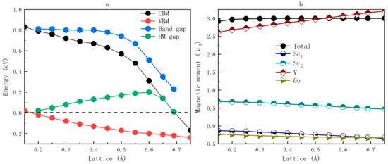 Figure 6a shows the calculated CBM, VBM, band gap, and half-metallic band gap in the spin-up channel at different lattice parameters for XA-type Sc2VGe. One can see that the half-metallic band gap gradually increases from 6.2 Å, and then gradually decreases after reaching a maximum value at 6.6 Å, and finally disappears at approximately 6.7 Å. More importantly, the maximum half-metallic band gap at around 6.6 Å is about 0.2 eV. Such a large value ensures that the half-metallic property of this material is not affected by external factors. On the other hand, we can see that the band gap in the spin-up direction of this material almost remains constant over the lattice range of 6.2 Å to 6.4 Å. When the lattice parameter is in the range of 6.4 Å to 6.7 Å, the band gap is significantly reduced.
