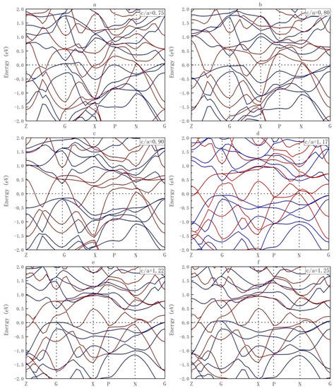 The effect of tetragonal distortion on the electronic structures of XA-type Sc2VGe was studied. Firstly, we studied the physical transition during a change in the c/a ratio when in the range of 0.75~1.25. As shown in Figure 7, when the range of c/a ratio is between 0.80 to 1.22 (see Figure 7b–e), the compound shows the HM property. On the other hand, it is a metal when the c/a ratio is lower than 0.80 (see Figure 7a) or higher than 1.22 (see Figure 7f).
