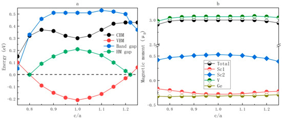 As shown in Figure 8a, the largest HM gap appears when c/a=1. As the c/a ratio increases (or decreases), the VBM in the spin-up channel gradually decreases, and therefore, the HM band gap decreases. The band gap does not change much when the c/a ratio is in the range of 0.85 to 1.15. The reason behind this can be understood from Figure 8a. In this interval, when c/a increases or decreases, although the VBM always decreases, the CBM shows an increasing trend, such that the overall band gap remains almost unchanged.