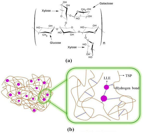 Structure of tamarind seed polysaccharide (TSP) (a) and schematic diagram of the TSP film after litmus lichen extract (LLE) addition (b).