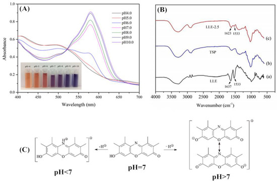 (A): UV–Vis spectra of the LLE at different pH values; (B): FTIR spectra of LLE (a), TSP film (b), and pH-sensing film (c); (C): the detail mechanism of LLE at different pH levels [22].