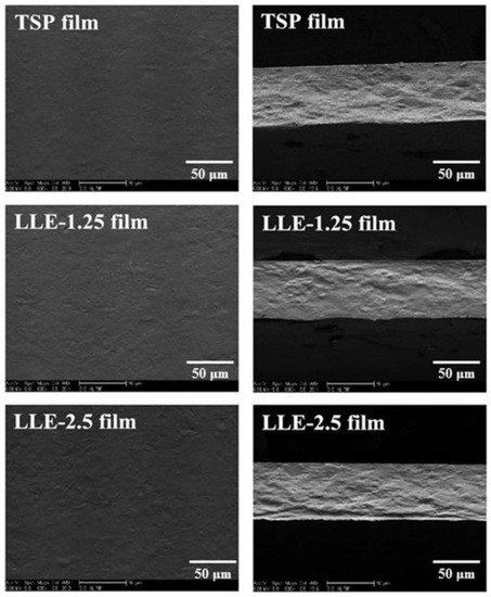 The thickness, tensile strength (TS), and elongation at break (EAB) of the TSP films with various concentrations of LLE are shown in Table 1. There was no significant change in the thickness of the films. However, with the increasing concentration of LLE up to 2.5%, the TS and EAB of the films decreased from 30.20 to 29.97 MPa and 69.74% to 60.13%, respectively, owing to the decrease in intramolecular and intermolecular interaction between the TSP molecules and plasticizers, which are correlated to the LLE structure and composition. In particular, the EAB value significantly decreased. These results corresponded to those obtained in the FTIR analysis.