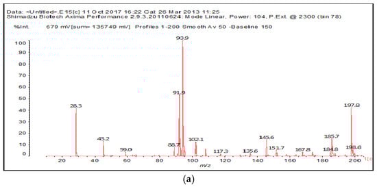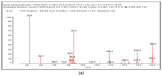 The MALDI-ToF of the two aldehydes first shown is for just the MALDI spectra of glyoxal and glutaraldehyde after reaction with the ionic liquid (Figure 3a,b and 4a–c). The species identified are shown in Table 3 and Table 4. Two main trends are noticeable: