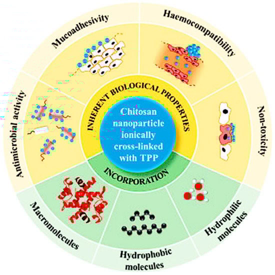 Characteristics of chitosan/triphenyl phosphate nanoparticles considered in this review: their inherent biological properties and ability to incorporate many bioactive species within them. Reprinted from Reference [].