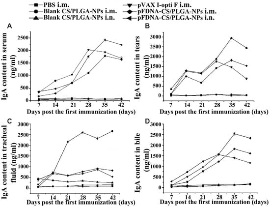Immunoglobulin A (IgA) antibody content in serum (A); tears (B); tracheal fluid (C); and bile (D) of specific pathogen free (SPF) chickens immunized with PBS i.m., blank CS/PLGA NPs i.m., blank CS/PLGA NPs i.n., pVAX I-optiF i.m., pFDNA-CS/PLGA-NPs i.m., and pFDNA-CS/PLGA-NPs i.n. Values are means ± SD (n = 5). Reprinted from Reference [].