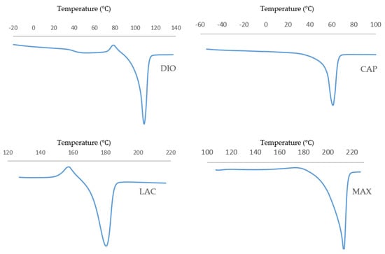 Thermal behavior of all materials is displayed in Figure 8. DIO shows an exothermic peak before melting which is related to the recrystallization of the polymer. For samples with higher degrees of degradation, the recrystallization temperature increases from 81.3 to 85.4 °C, which can be attributed to the larger lamellae requiring higher temperature and more energy for recrystallization.