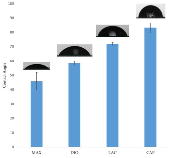 Figure 3 illustrates surface wettability, as determined by contact angle analysis of the four materials. Results show MAX as the most hydrophilic with a contact angle of 45.8° ± 1.8°, with increasing hydrophobicity of 58.4° ± 0.42°, 77.8° ± 1°, and 83.2° ± 3.3° for DIO, LAC, and CAP, respectively.
